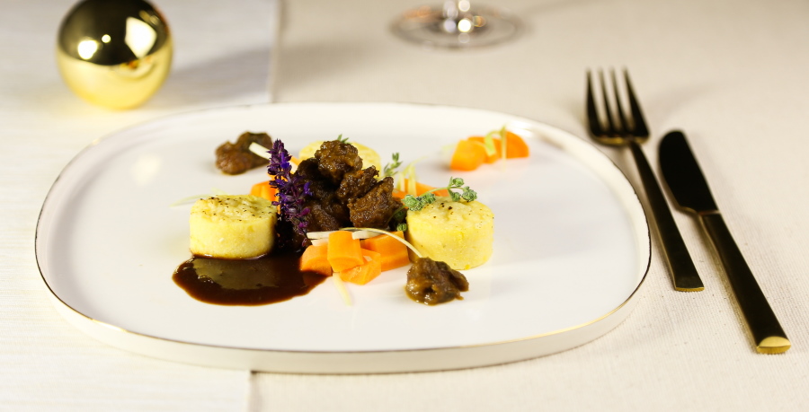Das Herzstück des Superieur-Hauptgangs ist natürlich das hervorragende Rindsentrecôte aus Schweizer Zucht. Das Fleisch hat einen exzellenten Geschmack und die Bauernbetriebe müssen die höchsten Standards erfüllen, die es in der Schweiz gibt, punkto Tierhaltung, Fütterung und Auslauf. Der Portweinjus wird mit unserem hauseigenen Saucenfond gemacht, dessen Wurzeln in der französischen Küche liegen. Die saisonale Gemüsebeilage aus Lauch, Rüebli und Federkohl passt auch farblich sehr gut zum überbackenen Landmais-Taler.